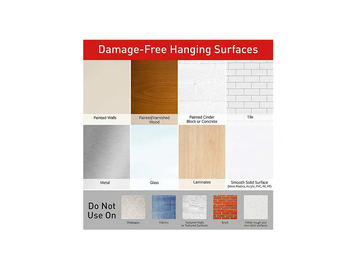 - VAHVA JA MONIPUOLINEN- Command-kuvaripustusliuskat pysyy voimakkaasti kiinni monilla erilaisilla sisäpinnoilla, kuten maalatut seinät, viimeistelty puu (maalattu tai lakattu lauta, kaapit tai ovet), maalattu betoniharkko, laminaatti, lasi, kaakeli, metalli, muut sileät pinnat