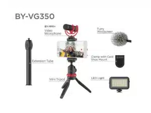 BOYA BY-VG350 on universaali videosetti älypuhelimelle, joka koostuu BY-MM1-mikrofonista, LED-valosta, älypuhelimen pidikkeestä, kuulapäästä, jatkoputkesta, minijalustasta ja lisälaitekiinnikkeestä.