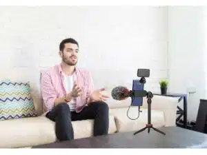 Vloggaajan setti suuntaavalla mikrofonilla, kolmijalalla ja lisätarvikkeilla
