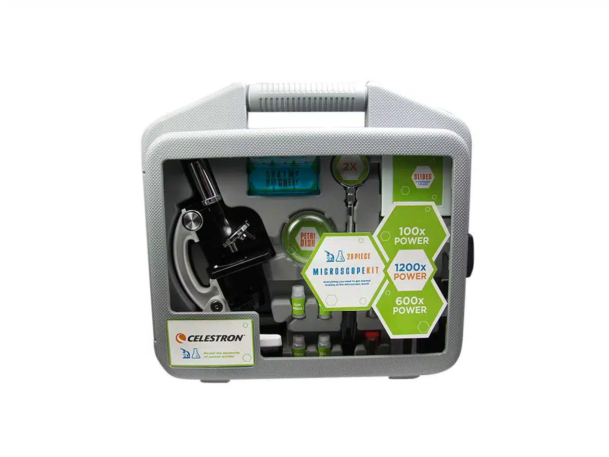 Celestron 28-osaisella mikroskooppi paketilla voit suorittaa kymmeniä omia tutkimuksia. Paketissa on mukana metallirunkoinen mikroskooppi kolmella linssillä (100-, 600- ja 1200-kertaisilla suurennoksilla), viisi valmista näytettä, sekä seitsemän tyhjää näytediaa peitinlaseilla. Mukana toimitetaan myös välineet, joilla voit hautoa katkaravun tutkittavaksi. Lisäksi paketissa on mukana kätevät tutkimusvarusteet, kuten pinsetit, suurennuslasi ja muovinen skalpelli.