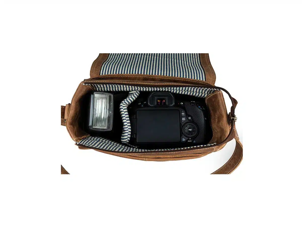 Laukun sisäosa ja kameraosio on valmistettu 100% puuvillasta. Puuvilla estää kameran ja lisävarusteiden naarmuuntumista. Laukun voi sulkea vetoketjulla ja metallisoljilla. -Nopeasti saatavilla, tai vetoketjulla turvallisemmin kiinni.