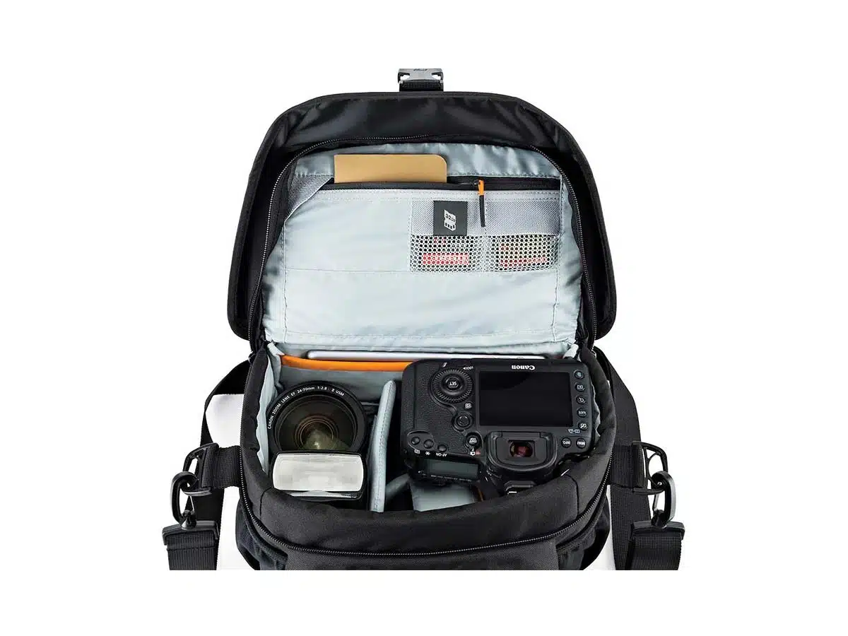 - Sopii Pro DSLR -kameralle jossa 24-105mm objektiivi kiinnitettynä sekä tilaa 3-4 lisäobjektiiville, salamalle ja pienille lisätarvikkeille