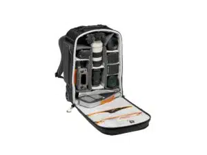- Ammattilaistason täyskuvakoon järjestelmäkamera (kuten Canon EOS 1D / 5D akkukahvan kanssa) tai ammattilaistason peilitön järjestelmäkamera (Sony A9) varustettuna 70-200mm f/2.8 linssillä, 300mm f/2.8 linssi + 3-4 vaihtolinssilä / valaisinta. Jättämällä telefotolinssin pois, sisään mahtuu 2 täyskuvakoon kameraa + 4-5 linssiä / kuvausvaloa.