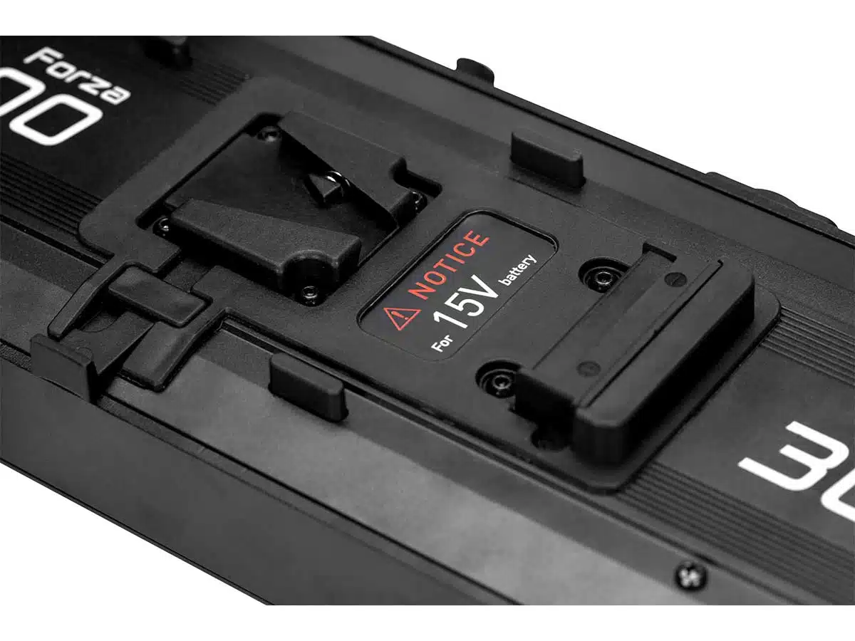 Studio- ja kuvauskohdekäyttöön tarkoitettu Forza 300 toimii joko AC-adapterilla tai 2x 14,4V V-Mount akuilla (eivät sisälly pakkaukseen) joten se toimii luotettavasti huolimatta verkkovirran saatavuudesta.