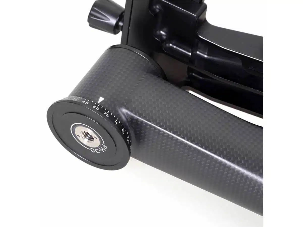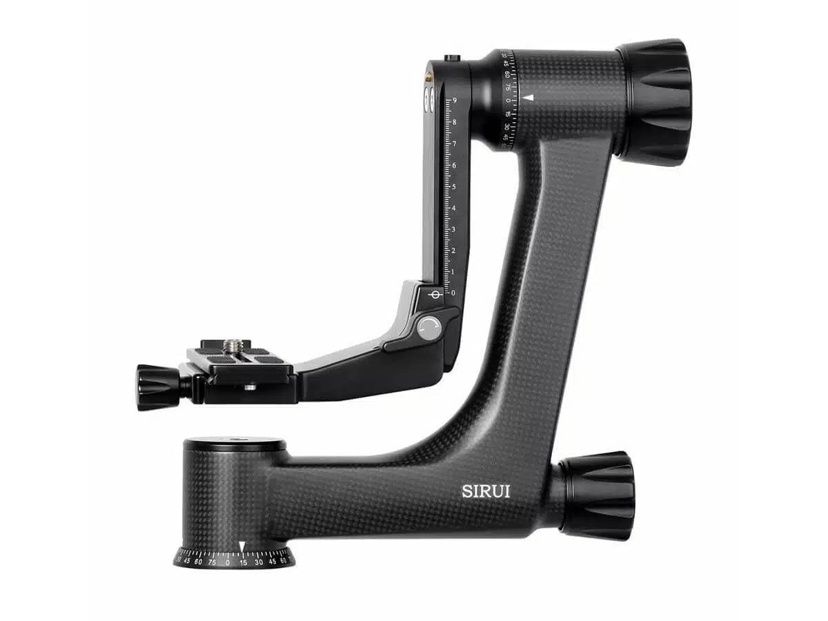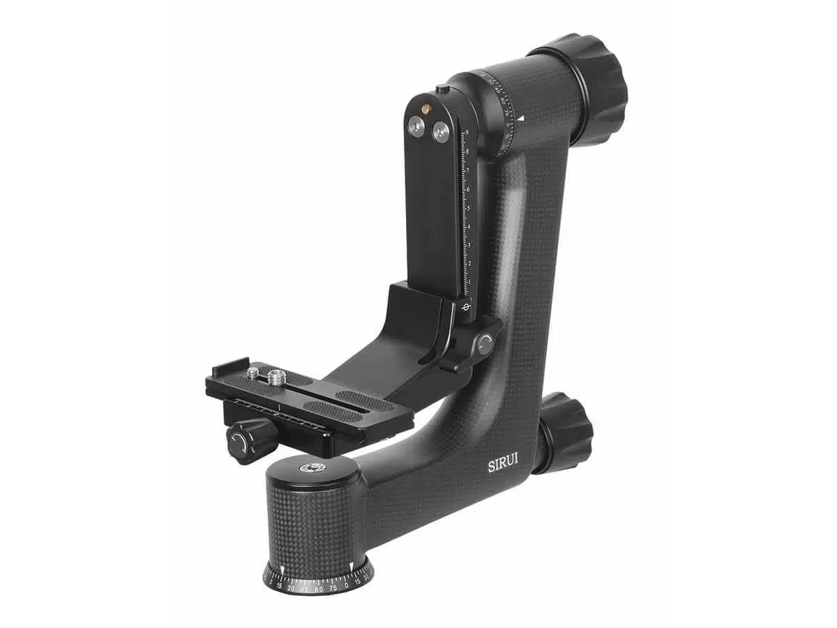 Sirui PH-30 Gimbal Head hiilikuitukiikku sisältää 120mm Arca Swiss-yhteensopivan pikairroitusalustan, jossa on kitkakumipinnoite ja 1/4″ ja 3/8″ ruuvi.