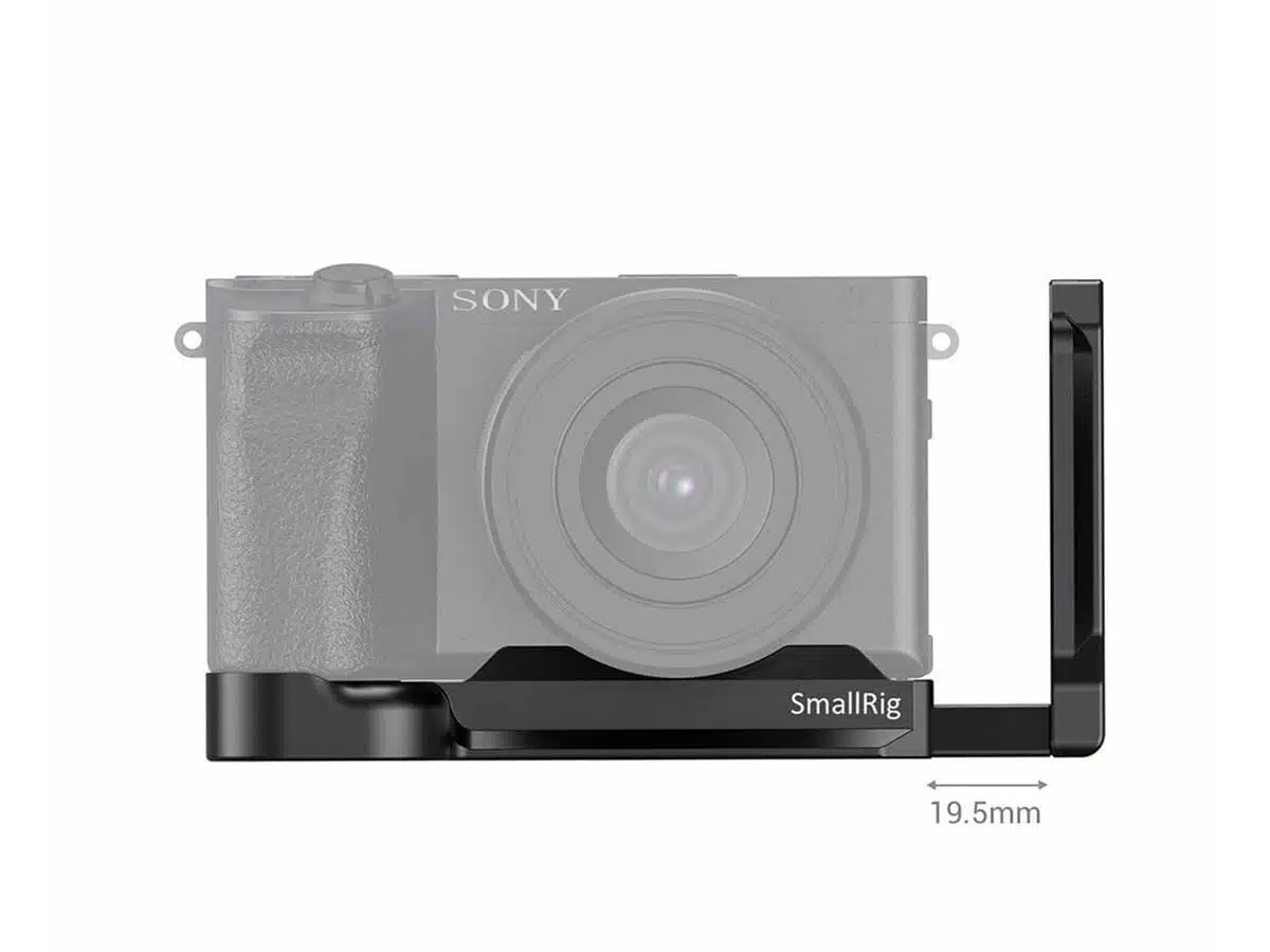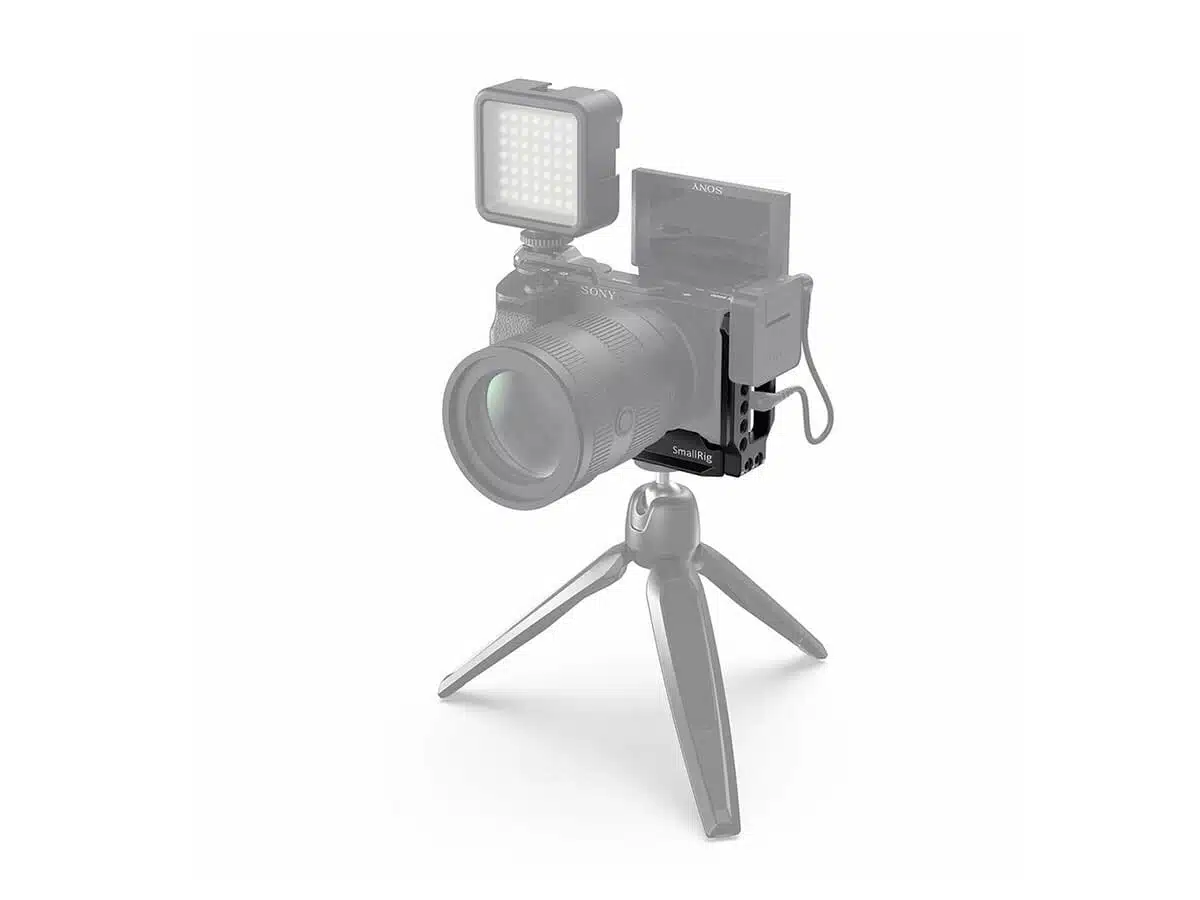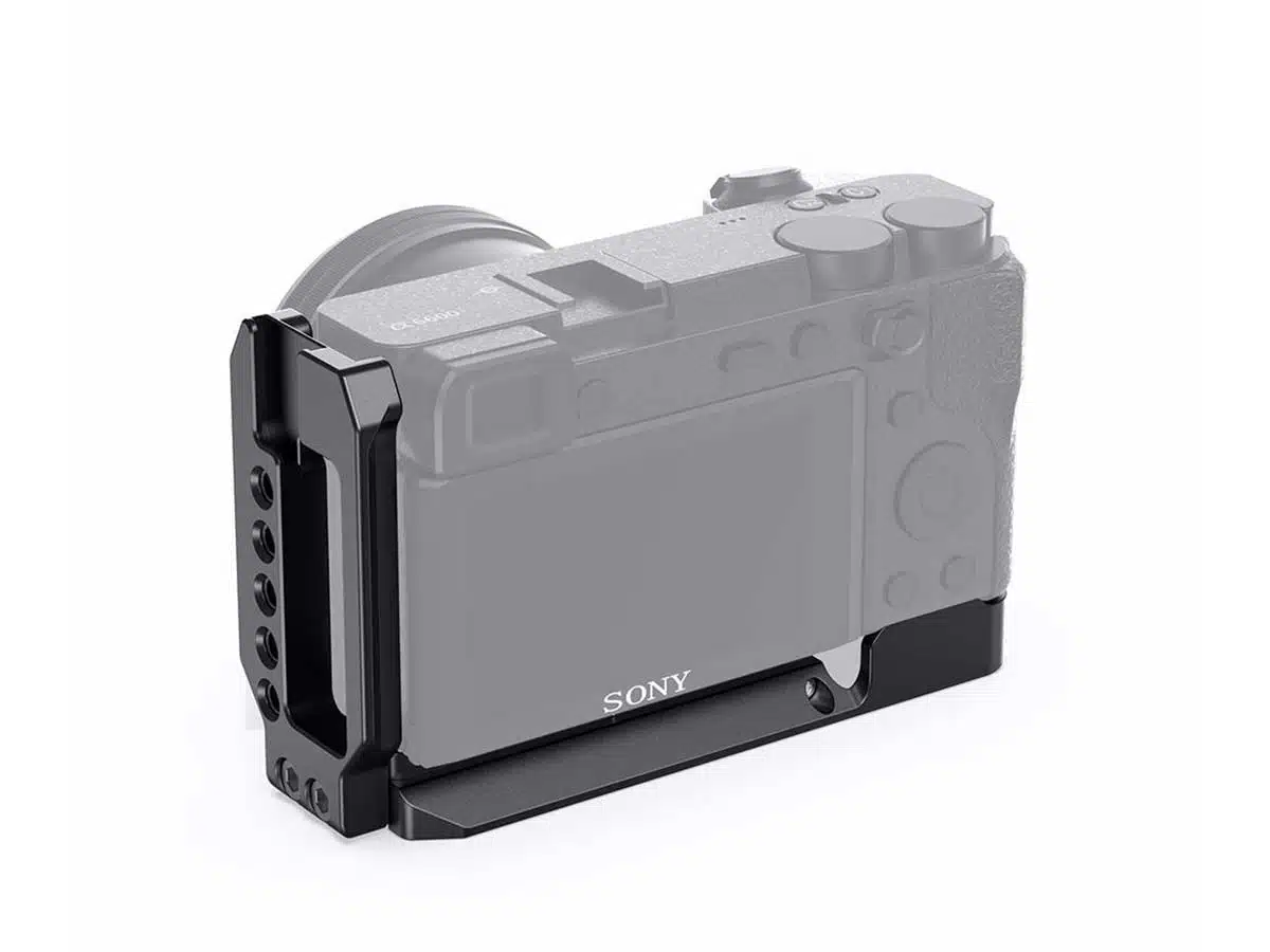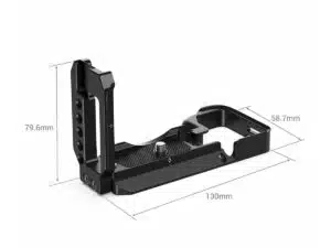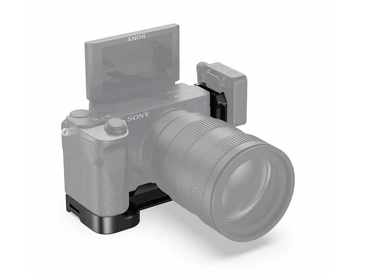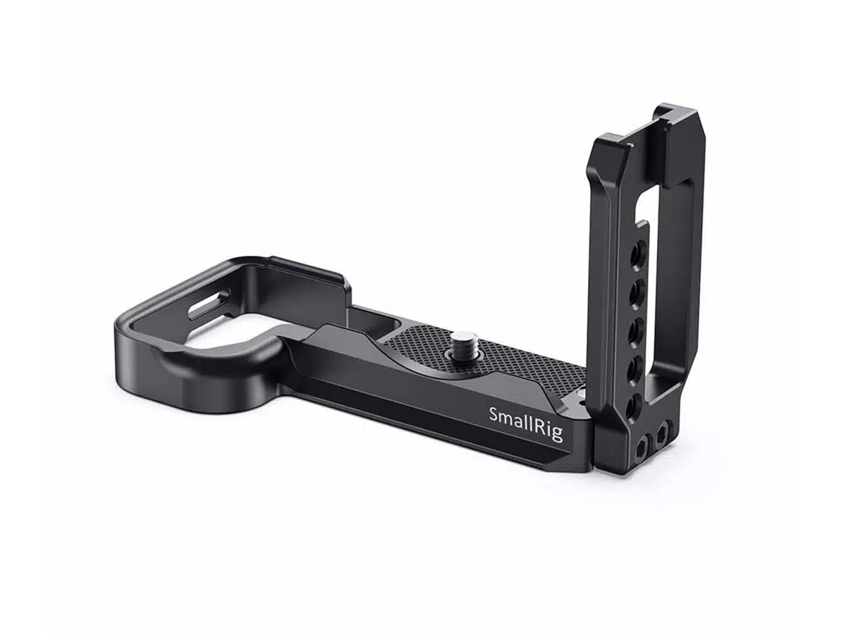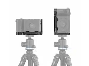 L:n muotoinen kiinnityslevy on muotoiltu kameran pohjan profiiliin sopivaksi ja kiinnittyy tukevasti 1/4″-20 jalustaruuvilla paikalleen. Rakenne estää kameran kiertymisen ja pitää sen tiukasti suunnassaan.