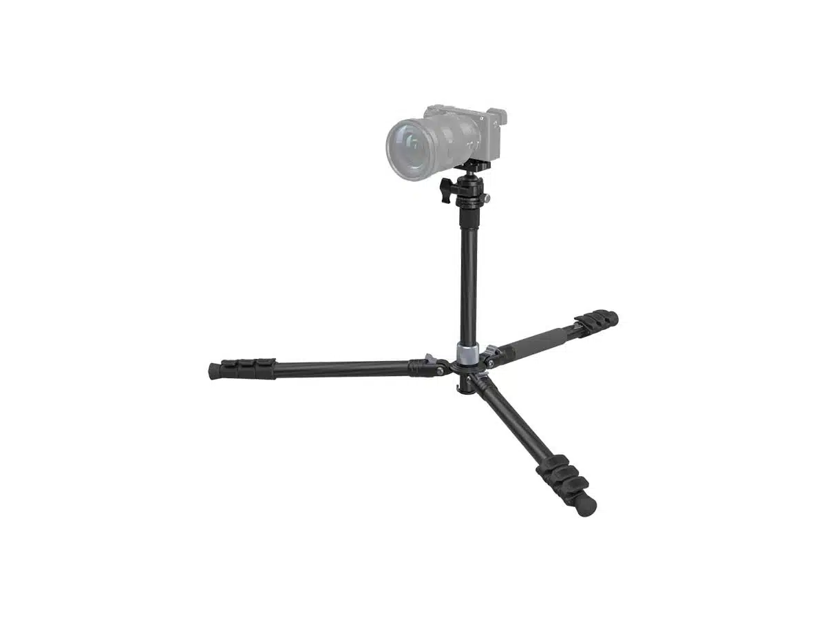- Irrotettava keskipylväs voidaan kääntää matalan kulman kuvauksia varten, ja yksi jaloista toimii erikseen jalustan pään kanssa ja muuttuu monopodiksi.
