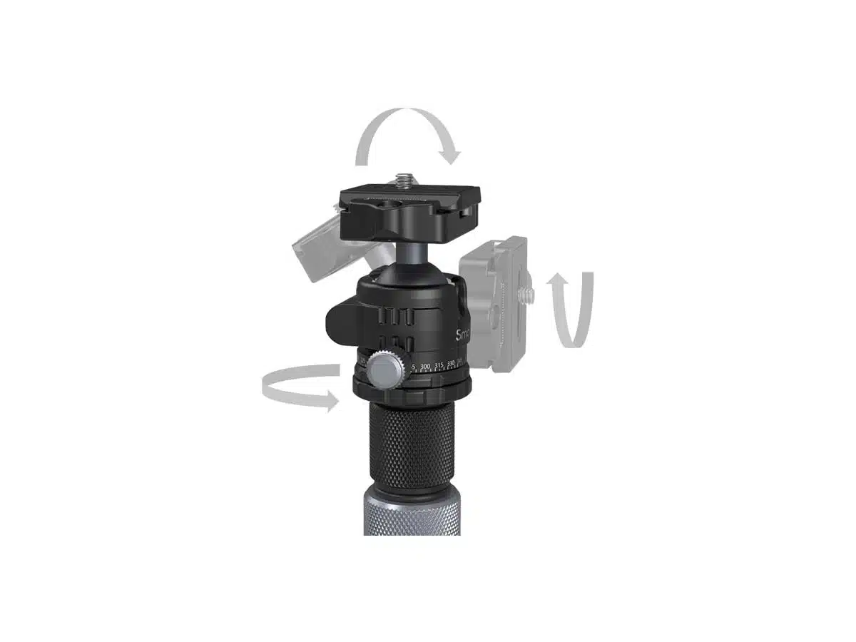 - Jalustassa on lukitusnuppi, jolla kulmaa voidaan säätää nopeasti kolmen aseman (23°/55°/85°) välillä, ja sen yläosassa on Arca-Swiss-pikakiinnitys panoraamapää, jota voidaan kääntää 360° ja kallistaa 90° pystysuoraa kuvausta varten.