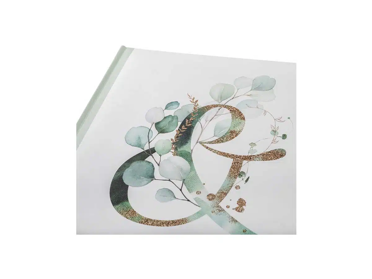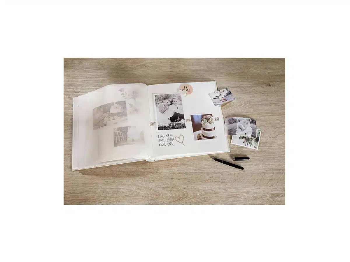 Kirjasidottu hääalbumi kohokuviolla, laadukkaalla laminoidulla taidepainatuskansilla. Albumin koko on 28×30,5 cm, ja siinä on 50 valkoista sivua hapottomasta valokuvapahvista ja valkoisilla pergamiinisilla suojasivuilla