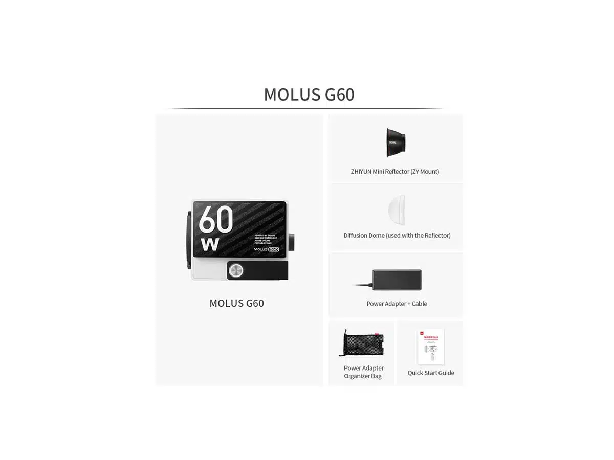 Zhiyun Molus G60 on taskukokoinen ja helppokäyttöinen LED-valaistus valokuvaukseen, videokuvaukseen ja suoratoistoon. Zhiyunin Molus-sarja on erittäin kompakti ja kannettava sarja, joka on suunniteltu toimimaan yhtä hyvin kaikissa tilanteissa riippumatta siitä, oletko osa pientä luovaa tiimiä, freelancer tai amatöörivideokuvaaja.